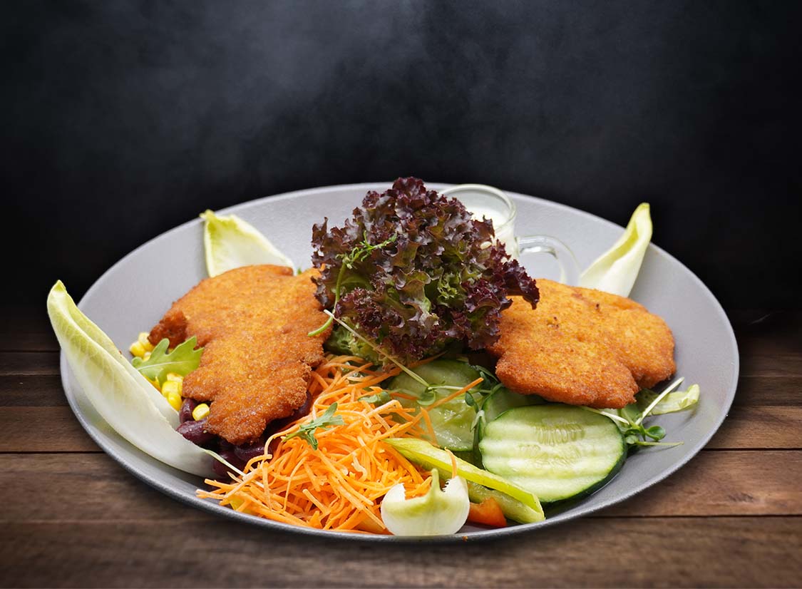 gebackenes Hühnerfilet, Sauerrahm, Paprika, Tomaten, Gurken, Zitrone, Cocktailsauce und Salat