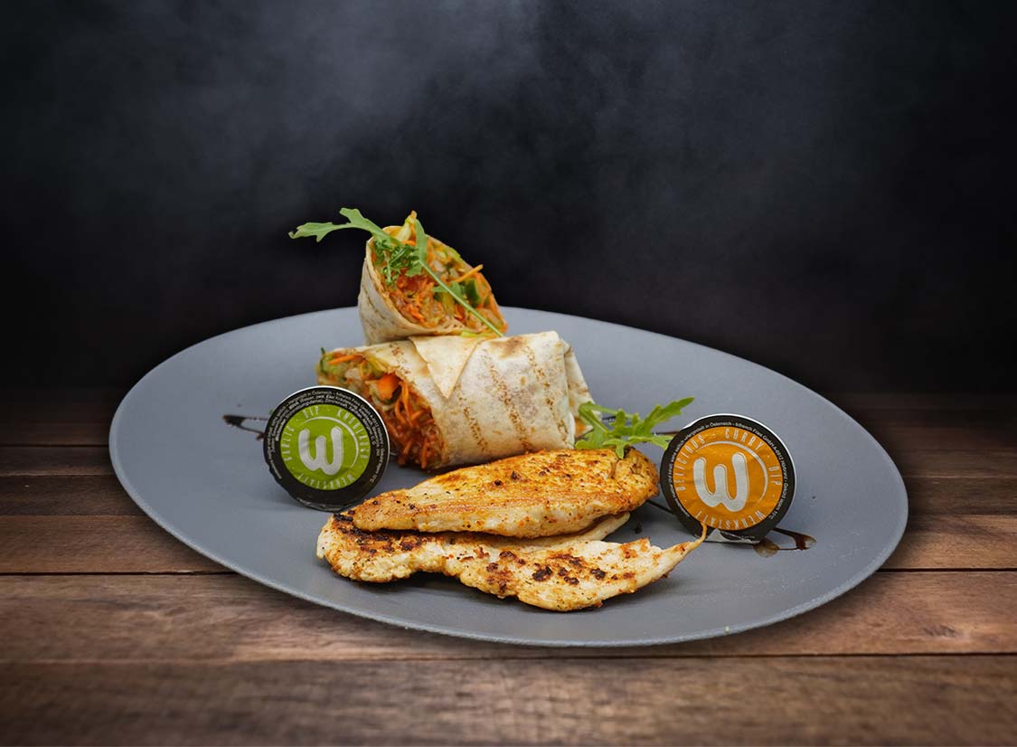 gebratenes Hühnerfleisch, dazu ein cold Wrap, gefüllt mit Eisbergsalat, Tomatensauce, Gurken, Paprika und Karotten