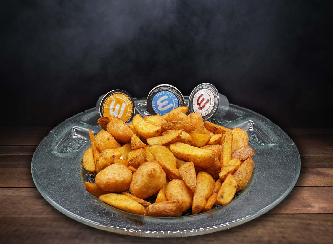 4 St. Buffalo Wings, 4 St. Chilli-Cheese-Nuggets, 2 St. Chicken-Double-Sticks und 4 St. Mozzarella Sticks mit Potato Wedges und verschiedenen Dips