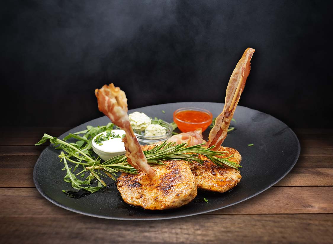 Medaillons vom Schwein, Huhn und Rind vom Grill mit knusprig gebratenem Speck, Potato Wedges, Paprika, Zwiebelringe, Gemüse und Grilltomate, dazu Dips
