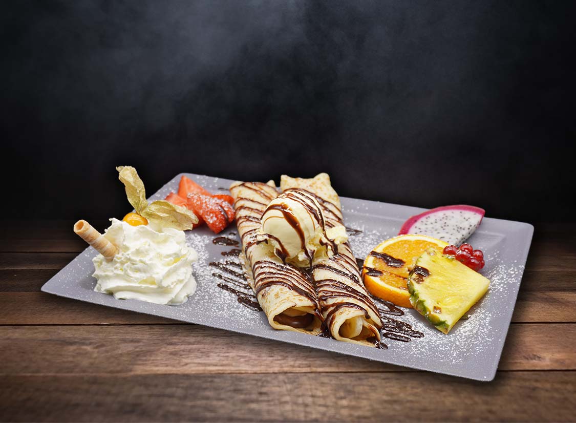 Köstliches Vanilleeis mit Bananenhälften garniert mit Mandelsplittern, Schokosauce und Schlagobers