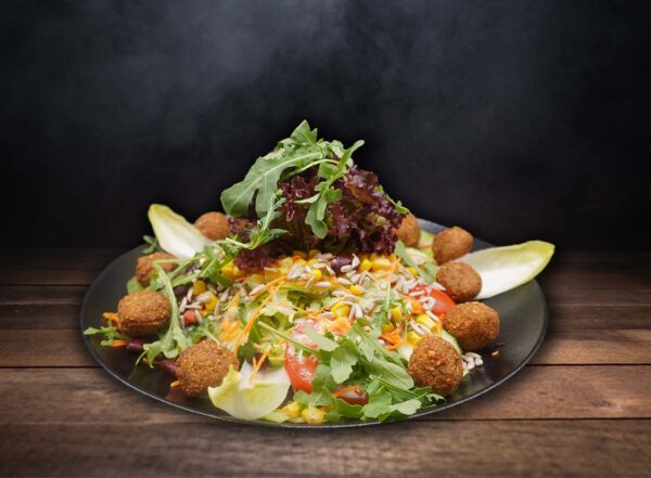 mit herzhaft marinierten Salat, Falafelbällchen und Sonnenblumenkerne