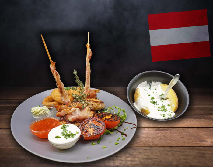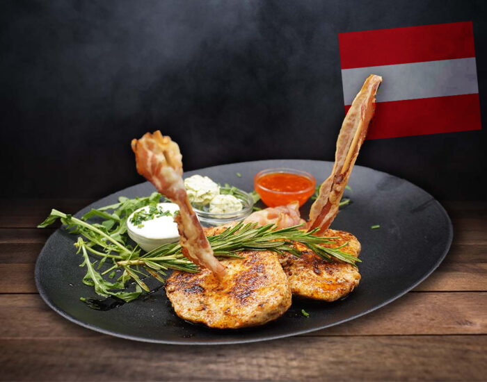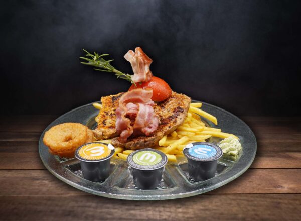 Medaillons vom Schwein, Rind und Huhn mit Pommes frites, gebackene Zwiebelringe, Speck, Kräuterbutter und verschiedenen Dips