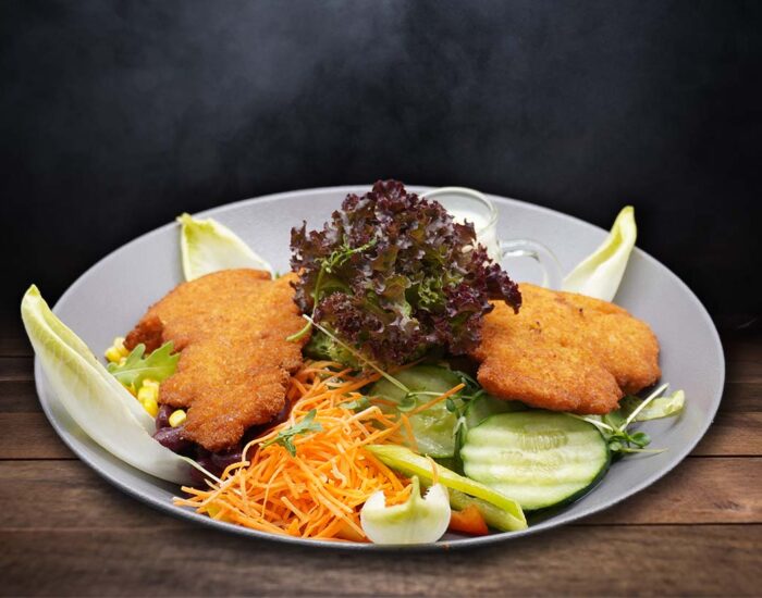 gebackene Hühnerfilets auf gemischtem Salat an Joghurtdressing