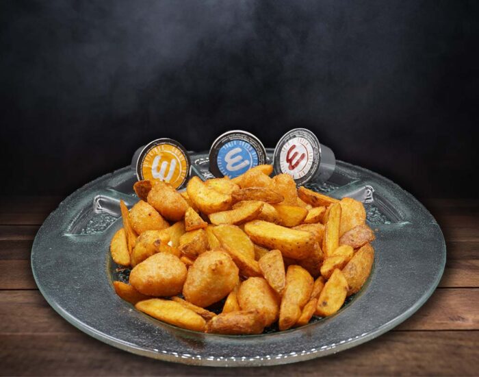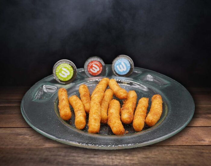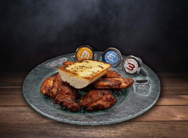 pikante Hühnerflügel mit verschiedenen Dips und Knoblauchbrot
