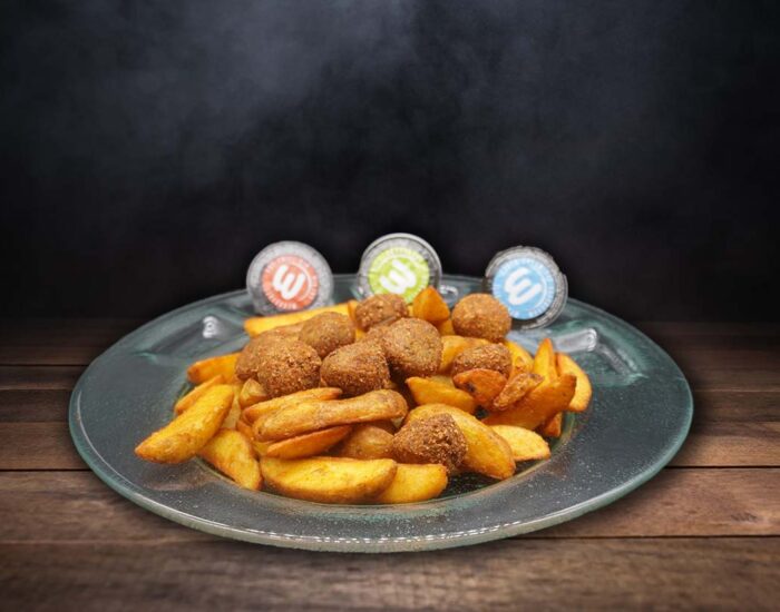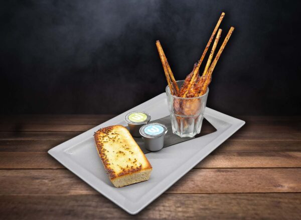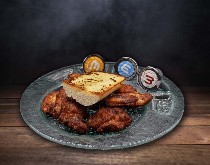 pikante Hühnerflügel mit verschiedenen Dips und Knoblauchbrot