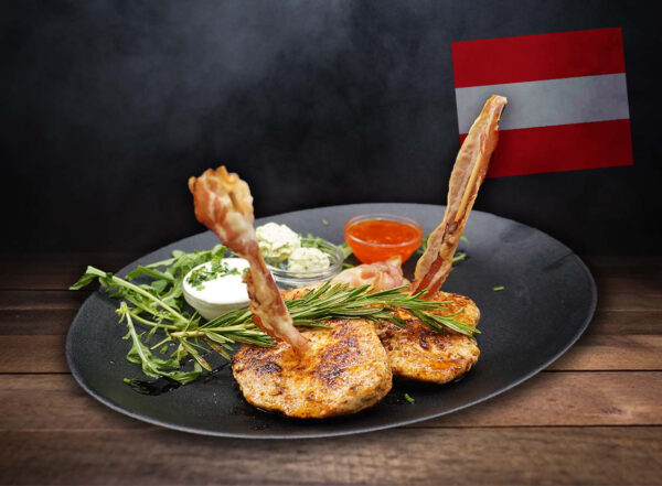 Medaillons vom Schwein Wiener Art, Rind und Huhn vom Grill mit Pommes frites, gebackenen Zwiebelringen, Speck, Kräuterbutter und verschiedenen Dips