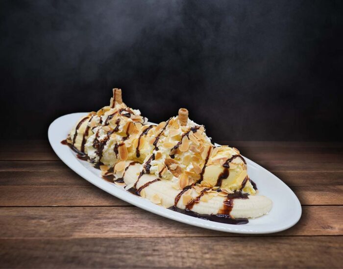 Köstliches Vanilleeis mit Bananenhälften garniert mit Mandelsplittern, Schokosauce und Schlagobers