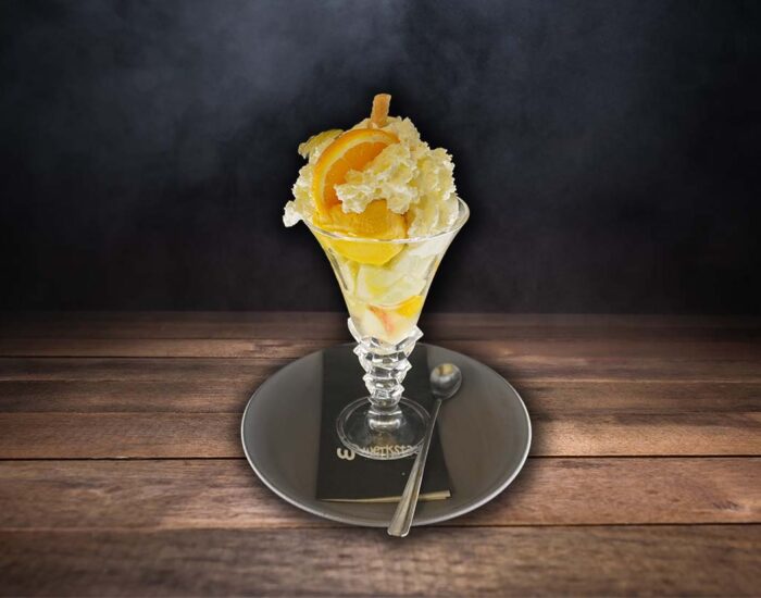 Köstliches Vanilleeis und eisgekühlter Kaffee garniert mit Schlagobers