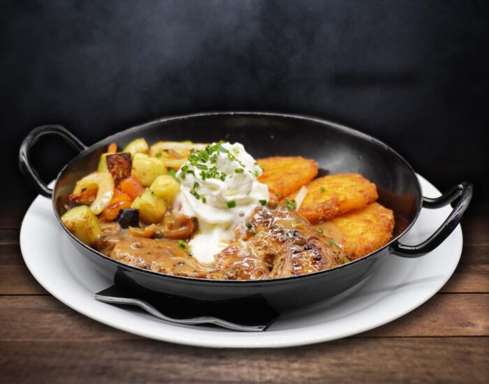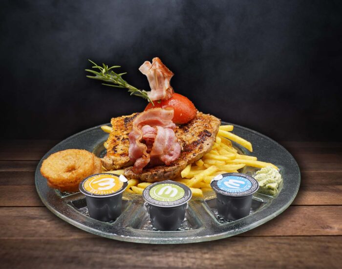 Medaillons vom Schwein, Rind und Huhn mit Pommes frites, gebackene Zwiebelringe, Speck, Kräuterbutter und verschiedenen Dips