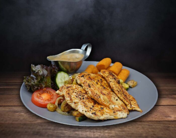 gegrilltes vom Huhn mit Gemüse, Kartoffel-Kroketten und Champignonsauce