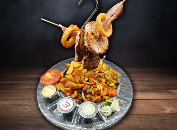 Medaillons vom Schwein, Huhn und Rind vom Grill mit knusprig gebratenem Speck, Potato Wedges, Paprika, Zwiebelringe, Gemüse und Grilltomate, dazu Dips
