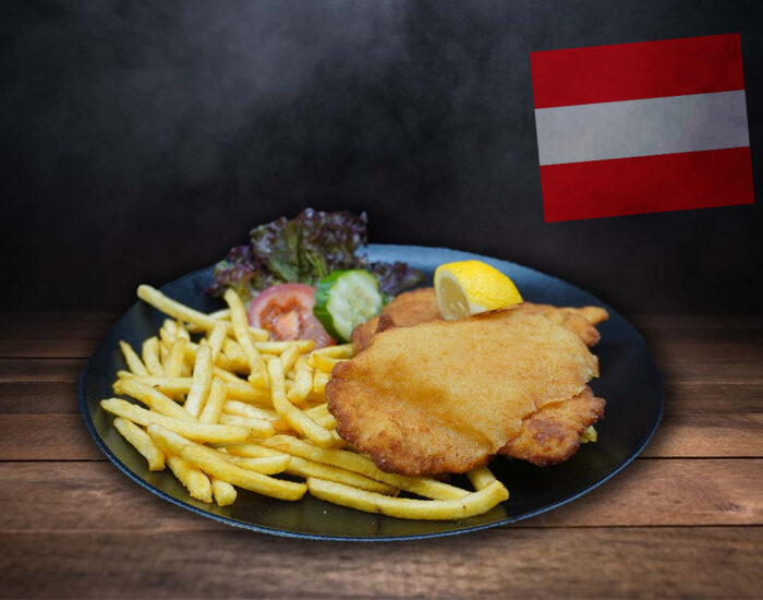 vom Schwein mit Pommes frites und Preiselbeeren