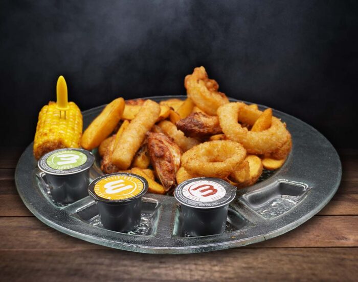 4 Stk. Buffalo Wings, 4 Stk. Zwiebelringe, 4 Stk. Mozzarellasticks und 1/2 Stk. Maiskolben mit Potato Wedges und verschiedenen Dips