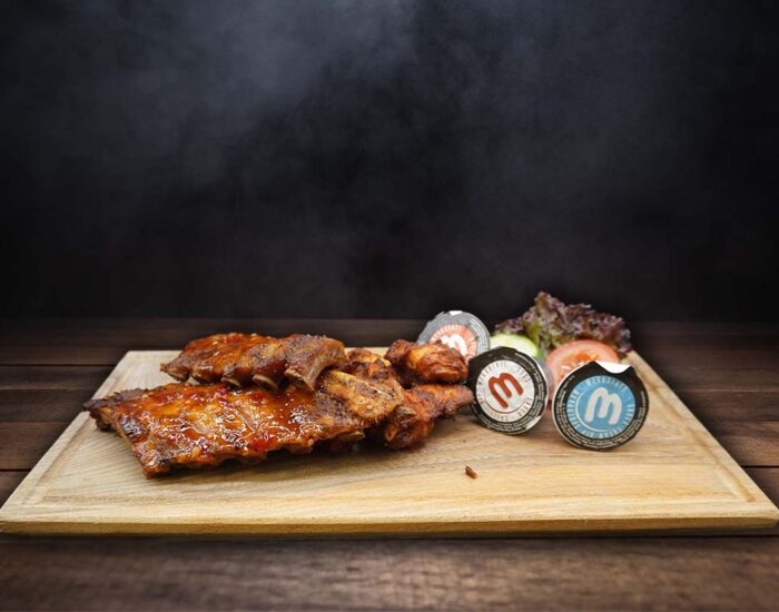 saftig, herzhaft marinierte Ribs und feurig scharfe Buffalo Wings mit verschiedene Dips
