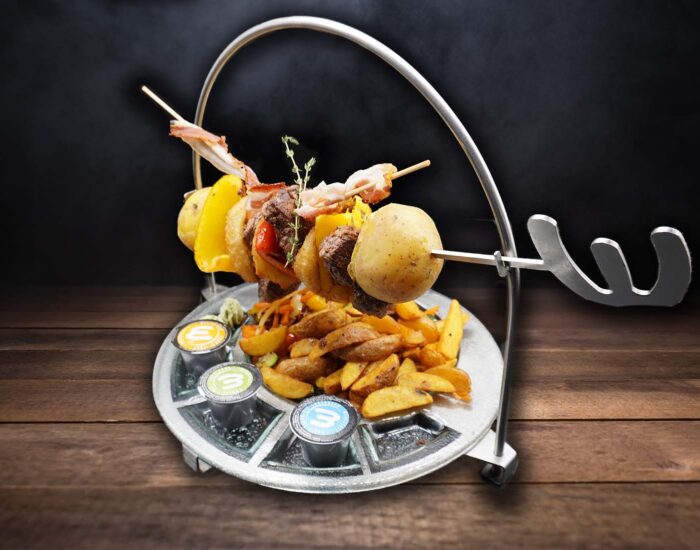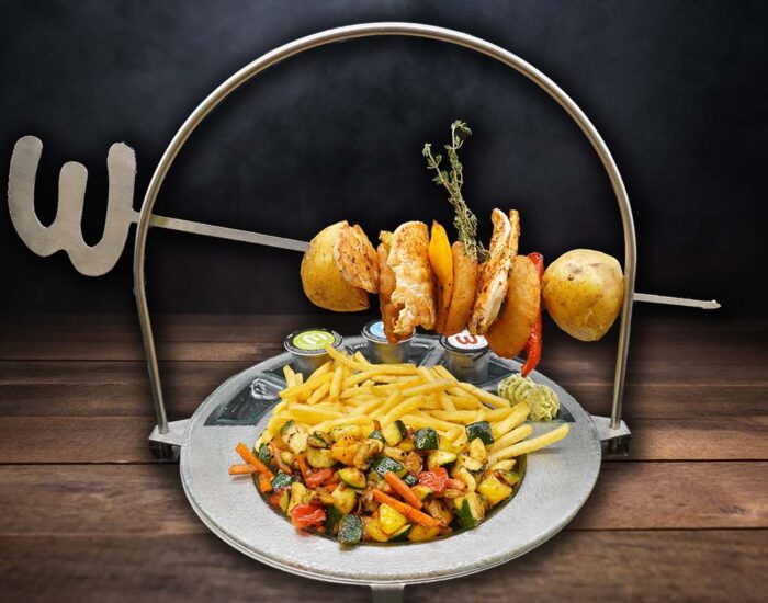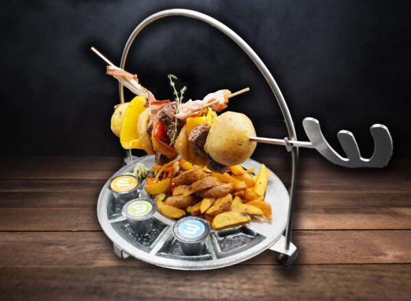 mit Schweinemedaillons, Speck, Zwiebeln, Potato Wedges, Grillgemüse, Kräuterbutter, Ofenkartoffel und den pikanten Werkstatt Dips